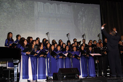 Nhạc trưởng Nguyễn Hoàng Hương điều khiển dàn hợp xướng Ngàn Khơi trong sử ca "Ải Chi Lăng" của cố nhạc sĩ Lưu Hữu Phước. (Hình: Ngọc Lan/Người Việt)