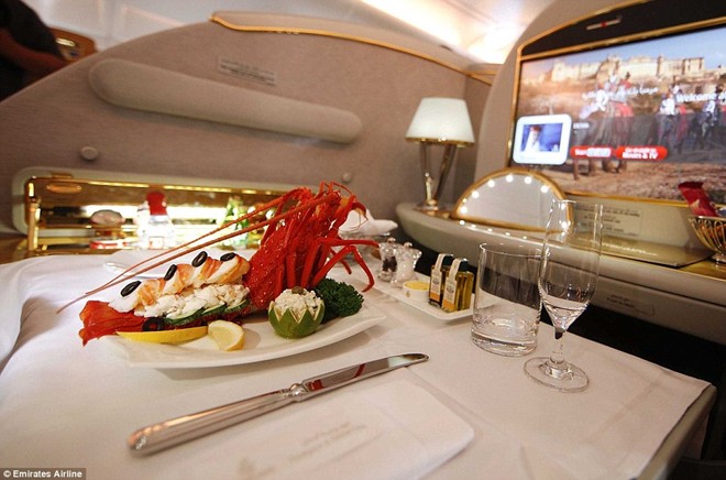 Hành khách hạng nhất và hạng thương gia của hãng Emirates được thưởng thức trứng cá hồi Iran hoang dã với kem chua và bánh kếp, cùng rượu vang hảo hạng. Đồ ăn của hãng được miêu tả như ở một nhà hàng 5 sao. Ảnh: Dailymail.co.uk