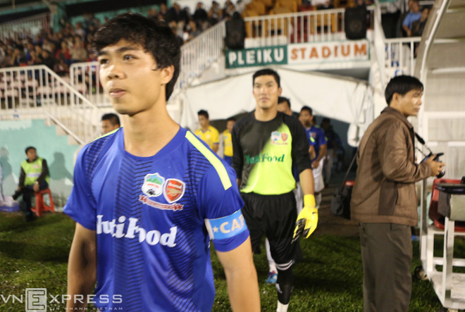Công Phượng trong vai trò đội trưởng dẫn đầu toàn đội Hoàng Anh Gia Lai ra sân Pleiku thi đấu dưới màu áo đội một tại giải đấu tập huấn mang tên Cup Tứ hùng HAGL.