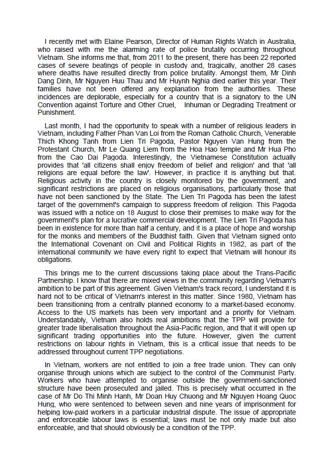 Gần đây tôi đã gặp gỡ với Cô Elaine Pearson, Giám đốc của Tổ chức theo dõi nhân quyền (Human Rights Watch) tại Úc, cô đã báo động với tôi tỷ lệ bạo hành của cảnh sát Việt Nam đang gia tăng khắp nơi trong nước. Cô thông báo với tôi rằng, từ năm 2011 đến nay, đã có 22 trường hợp được báo là đã đánh đập nặng nề những người bị giam giữ, và thảm kịch là 28 trường hợp tử vong, kết quả trực tiếp từ sự bạo hành của cảnh sát. Trong đó, ông Đinh Đăng Định, ông Nguyễn Hữu Thâu và ông Huỳnh Nghĩa qua đời đầu năm nay. Gia đình của họ đã không được cung cấp bất kỳ lời giải thích từ các cơ quan chức năng. Những tỷ lệ mắc phải thật là tồi tệ, đối với một nước đã ký kết Công ước Liên Hiệp Quốc về Chống Tra tấn và bạo hành, hay đối xử vô nhân đạo hoặc trừng phạt tù nhân.