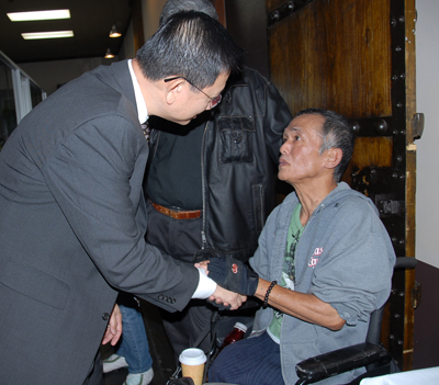Luật Sư Andrew Đỗ (trái) lắng nghe ông Hoàng Nguyễn ngồi trên xe lăn tại buổi họp báo. (Hình: Linh Nguyễn/Người Việt)