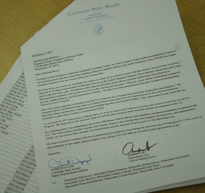 Lá thư và danh sách 500 sĩ quan gởi Dân Biểu Ed Royce, để vận động cho thương phế binh. (Hình: Linh Nguyễn/Người Việt)