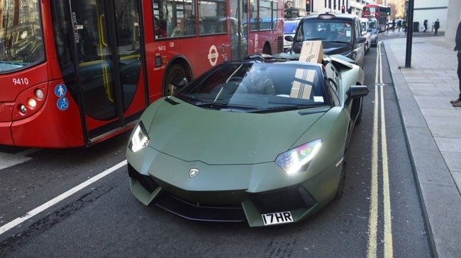 Chiếc siêu xe Lamborghini Aventador Roadster màu xanh quân đội mờ đã gây bất ngờ khi chở hàng trên đường phố London. Bản thân màu sơn, đề-can súng máy bên hông và chính chiếc siêu xe Lamborghini Aventador Roadster đã khiến nhiều người phải chú ý. Tuy nhiên, với gói hàng khá dài nằm trên xe, chiếc Lamborghini Aventador Roadster còn nổi bật hơn nữa.