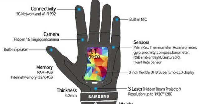 Theo mô tả từ h́nh ảnh phác thảo, smartphone h́nh găng tay của Samsung sẽ sử dụng một màn h́nh cảm ứng 3 inch nằm ở ḷng bàn tay c̣n các ngón tay sẽ phục vụ cho các chức năng khác nhau. Có thể kể đến là chơi nhạc qua loa ngoài bằng ngón cái), kết nối Wi-Fi, 5G, quay camera 16 megapixel bằng ngón trỏ hay nghe điện thoại bằng microphone hoặc đo nhịp tim bằng ngón út.