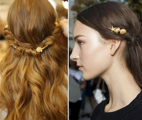 Những chiếc băng đô, kẹp tóc với họa tiết san hô, ốc biển... đặc biệt phù hợp cho mùa hè nóng bức. Điểm mới đáng chú ý là loạt phụ kiện này đều được phủ màu vàng nên chúng phù hợp với mọi màu tóc, tuy đơn giản nhưng ẩn chứa nét thanh lịch, cuốn hút tuyệt vời. Thương hiệu thời trang Valentino đã tạo nên "cơn sốt" khi liên tục tung ra nhiều mẫu tóc duyên dáng được nhấn nhá tinh tế bằng loại phụ kiện lấy cảm hứng từ biển.