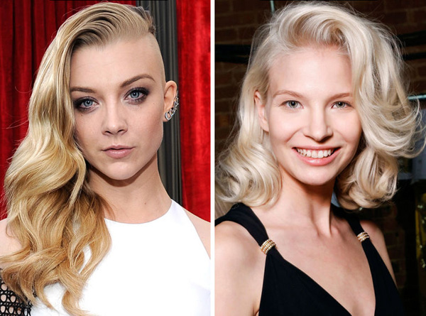 Tóc vén vào sau tai (ảnh phải) là mốt của năm 2015 này, thay thế xu hướng cạo một bên và tóc một bên của năm 2014 (ảnh trái) - Ảnh: Getty