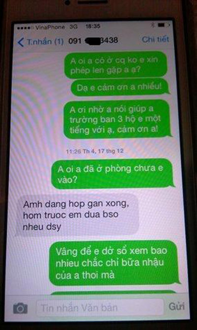 Số máy từ nữ doanh nhân: Thôi e cũng chẳng hợp làm việc với a đâu, cũng sẽ không bao giờ làm việc nữa a cho e xin lại phong vì mà mấy lần e đưa cho a, a cũng nói giúp a trường trưởng ban giúp e. Phong vì e đưa doi với các a ko nhieu, nhưng là mà đối với e thì rất quan trọng, nén a gũi lại cho e nhé!!! Nếu a có cho thêm e thì tốt vì e rất nghèo a ạ!