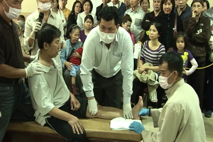 Trên những băng ghế xung quanh căn phòng rộng 40x40 feet, những học trò và trợ lý của nhà sư cũng làm việc với những bệnh nhân bị đau lưng và những vấn đề cơ bắp khác bằng phương pháp bấm huyệt, nắn khớp xương và xoa bóp.