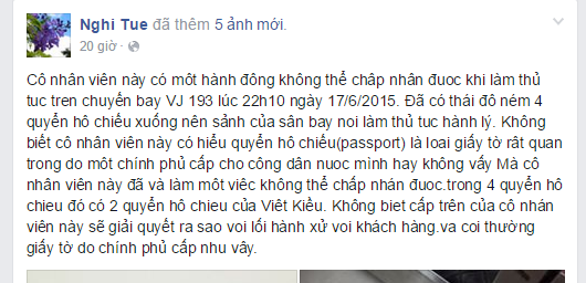 Nội dung dòng trạng thái đó của Nghi Tue cho biết: “Cô nhân viên này có một hành động không thể chấp nhận được khi làm thủ tục trên chuyến bay VJ 193 lúc 22h10 ngày 17/06/2015.