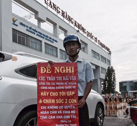 Người cầm bảng đòi gặp con là anh Nguyễn Văn Thành (34 tuổi, Q.12, TP.HCM). Sự việc xảy ra vào ngày 20/7 ở sân bay Tân Sơn Nhất. Tuy nhiên, chỉ vừa đứng được khoảng 15 phút thì anh Thành bị lực lượng an ninh sân bay mời đi chỗ khác.Qua lời kể, anh Thành cho biết mình và vợ là chị Trần Thị Hải Vân (33 tuổi) kết hôn từ năm 2001. Hai vợ chồng có hai người con. “Giữa hai vợ chồng không còn tình cảm với nhau nữa nên đầu năm 2014 thì được tòa án chấp thuận cho ly dị. Tuy nhiên, cả hai đã thỏa thuận sẽ vẫn ở chung với nhau để tránh cho con cái bị tổn thương”, anh Thành cho biết.Dù vậy, quyết định cuối cùng của tòa án là quyền nuôi hai con thuộc về chị Vân. Sau khi ly dị, hai người sống chung cùng một mái nhà được khoảng 1 năm thì đến tháng 1/2015, chị Vân mang theo hai con biến mất. Người chồng nhớ lại: “Hôm ấy, sau khi tôi đón vợ con về nhà thì cô ấy dẫn hai bé đi ăn tối. Thấy lâu không về, tôi gọi lại thì vợ không nghe máy, cuộc gọi tiếp theo thì không còn liên lạc được”.