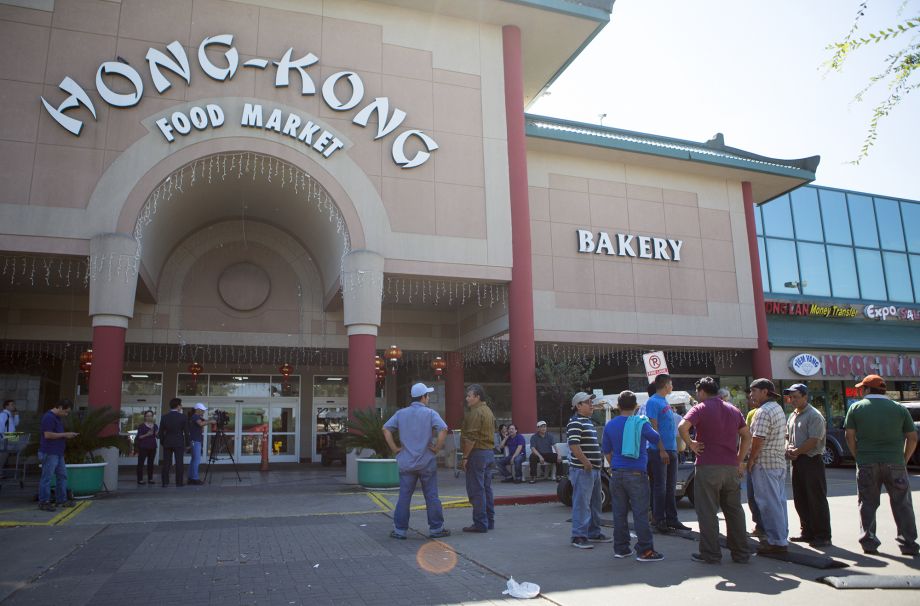 Khách hàng chờ bên ngoài chợ Hong Kong 4 vào chiêu thứ hai khi chợ bị đóng cửa sau vụ nhân viên nổ súng bắn chết sếp rồi tự sát – Photo Courtesy: Houston Chronicle