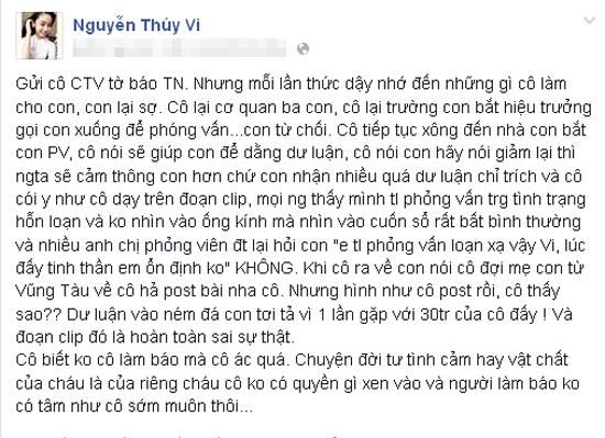 Trích dẫn dòng status của Thúy Vi: “Gửi cô CTV tờ báo TN. Nhưng mỗi lần thức dậy nhớ đến những gì cô làm cho con, con lại sợ. Cô lại cơ quan ba con, cô lại trường con bắt hiệu trưởng gọi con xuống để phóng vấn… con từ chối. Cô tiếp tục xông đến nhà con bắt con phỏng vấn, cô nói con hãy nói giảm lại thì người ta sẽ cảm thông con hơn chứ con nhận nhiều quá dư luận chỉ trích và cô nói y như cô dạy trên đoạn clip. Mọi người thấy mình trả lời phỏng vấn trong tình trạng hỗn loạn và không nhìn vào ống kính mà nhìn vào cuốn sổ rất bất bình thường. Nhiều anh chị phóng viên điện thoại lại hỏi con “em trả lời phỏng vấn loạn xạ vậy Vi, lúc đấy tinh thần em ổn định không” KHÔNG. Khi cô ra về con nói cô đợi mẹ con từ Vũng Tàu về cô hãy post bài nha cô. Nhưng hình như cô post rồi, cô thấy sao? Dư luận vào ném đá con tơi tả vì 1 lần gặp với 30 triệu của cô đấy! Và đoạn clip đó là hoàn toàn sai sự thật.