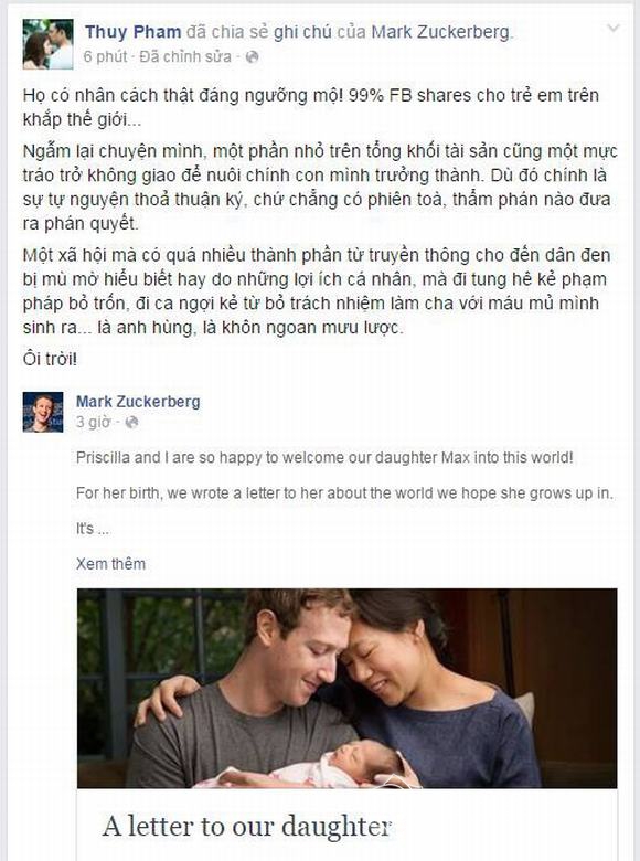 Mới đây, trên trang cá nhân, siêu mẫu Ngọc Thúy đã chia sẻ bức tâm thư của ông chủ Facebook viết cho con cùng lời bình luận: "Họ có nhân cách thật đáng ngưỡng mộ! 99% Facebook chia sẻ cho trẻ em trên khắp thế giới... Ngẫm lại chuyện mình, một phần nhỏ trên tổng khối tài sản cũng một mực tráo trở không giao để nuôi chính con mình trưởng thành. Dù đó là sự tự nguyện thoả thuận ký, chứ chẳng có phiên toà, thẩm phán nào đưa ra phán quyết.