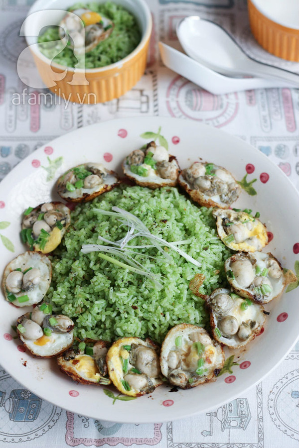 Trộn rau đã xay với cơm, cho từng hạt cơm tơi và có màu xanh của rau.