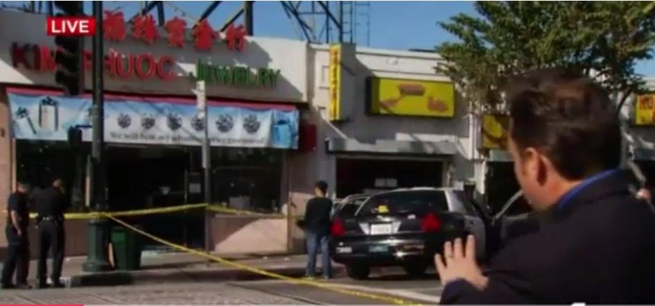 Sáng hôm thứ năm (7/1), cảnh sát Los Angeles đã nhận được một báo cáo về một vụ cướp tiệm nữ trang tọa lạc tại khu vực đông người Hoa ở Los Angeles. Cuộc gọi đầu tiên được ghi nhận vào khoảng 11 giờ sáng tại địa chỉ khu vực 800 đường North Broadway. Trong điện thoại khẩn cấp, người cung cấp thông tin cho biết là nhân viên bảo vệ đã bị tên cướp dí súng bắn.