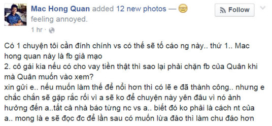 Chàng cầu thủ Việt kiều Mạc Hồng Quân vẫn đang gây sốt các trang mạng. Nhưng anh ta không gây sốt bởi tài năng trên sân bóng mà tên tuổi anh giờ đây được nhắc đến là một trong những cầu thủ đa tình nhất nhì làng túc cầu! Và cái sự đa tình khiến chàng tiền đạo điển trai luôn dính cả tá tin đồn với những hotgirls, chân dài trong giới showbiz. Mới đây, cầu thủ Than Quảng Ninh lại bị “bạn” tố vay tiền không trả, cư xử tồi tệ với Khánh Ly.