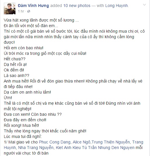 Ban đầu, nam ca sĩ từ chối nhưng nhìn thấy hoàn cảnh của cô gái khá khó khăn nên anh đã mạnh tay mua hết 600 tờ vé số để cô gái có thể nhanh chóng về nhà đón năm mới.
