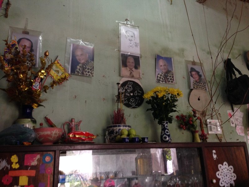 Trên nóc tủ, một bát hương nguội lạnh nằm dưới năm bức ảnh khổ A4 được phóng to, dán lên tường bằng băng dính.