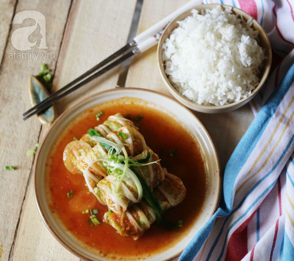 Lá cải thảo cắt bớt phần đui. Trải ra và cho thịt bò vào giữa sau đó cuốn lại như cuốn chả giò.