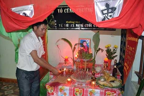 Vợ anh Trinh bên bàn thờ của nạn nhân xấu số.