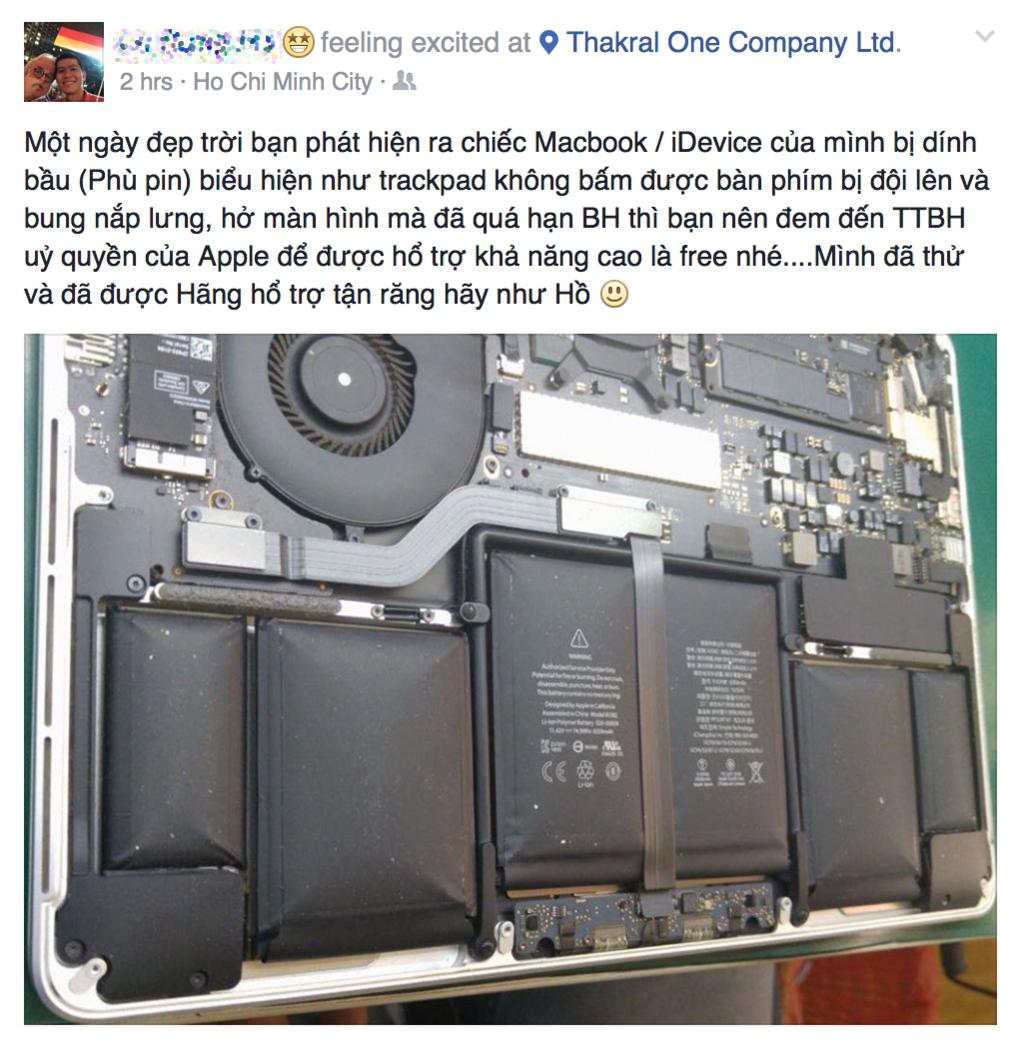 Nếu iPhone hay MacBook của bạn đã hết bảo hành nhưng pin bị phù thì các bạn có thể đem lên các trung tâm bảo hành chính hãng Apple để được đổi máy khác miễn phí (nếu là iPhone) và thay khung máy (nếu là MacBook). Tất nhiên là không phải máy nào cũng được nhưng hầu hết các máy từ 2013 trở lại đều thỏa mãn chính sách này. Trong trường hợp máy cũ quá thì các bạn có thể được thay với giá ưu đãi, vào khoảng 5 triệu đồng (bao gồm cả khung máy mới) với MacBook Pro Retina.