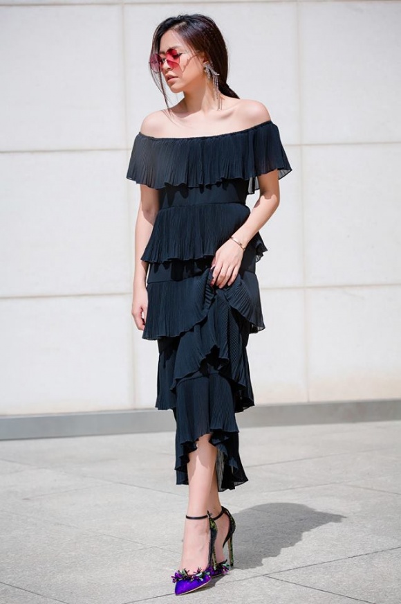 Old  Cool Thời trang đầm trễ vai gợi cảm của Hoàng Thuỳ Linh