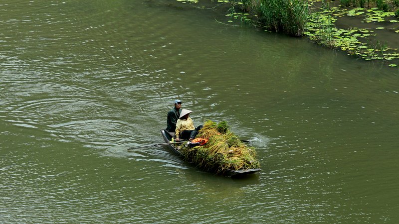 Con thuyền đầy ắp lúa vừa thu hoạch lướt nhẹ trên mặt sông Ngô Đồng.