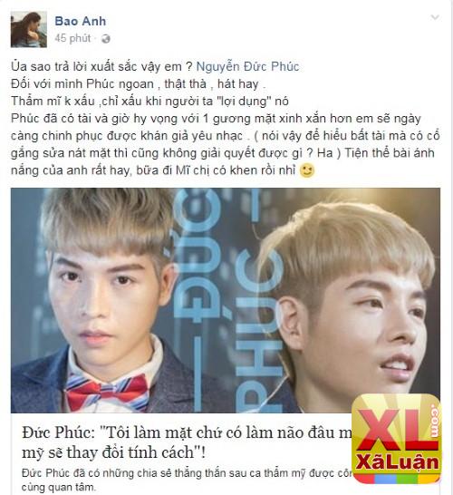 Cụ thể, bạn gái Hồ Quang Hiếu thẳng thắn khen ngợi tính cách của Đức Phúc ở ngoài đời: “Đối với mình Phúc ngoan, thật thà, hát hay. Thẩm mĩ k xấu, chỉ xấu khi người ta “lợi dụng” nó. Phúc đã có tài và giờ hy vọng với 1 gương mặt xinh xắn hơn em sẽ ngày càng chinh phục được khán giả yêu nhạc”. Khen đàn em hết lời về tài năng và ngoại hình hiện tại, đồng thời, nữ ca sĩ không quên nêu quan điểm rõ ràng: “Nói vậy để hiểu bất tài mà có cố gắng sửa nát mặt thì cũng không giải quyết được gì”.