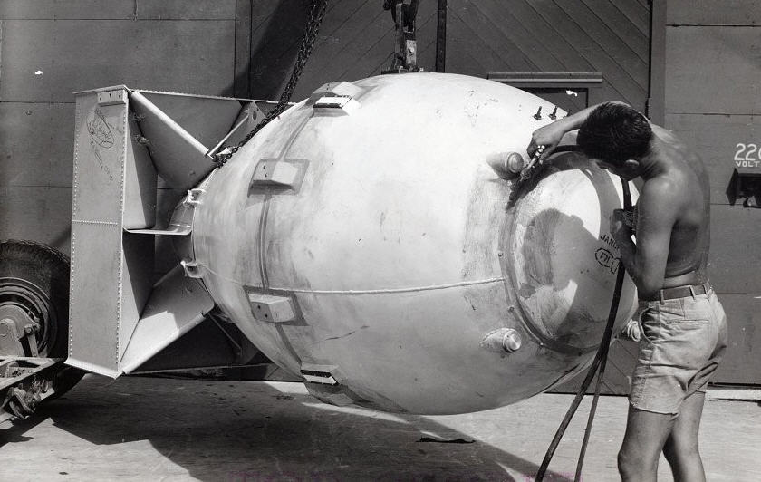 Các nhân viên kỹ thuật kiểm tra vỏ bom nguyên tử "Fat Man". Nhiều vỏ bom thử đã được tạo ra trên đảo Tinian thuộc quần đảo Bắc Mariana trên Thái Bình Dương. Tất cả đều giống với quả bom chính nhưng không có các thiết bị nổ.
