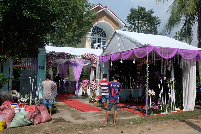 Toàn bộ không gian lễ cưới được trang trí sắc tím.