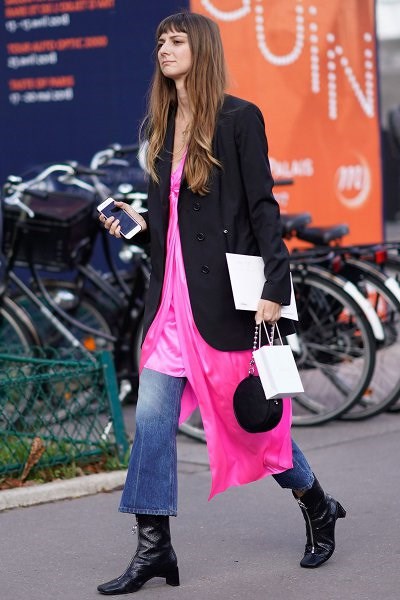 Việc gây cảm giác tò mò bằng cách để lộ chỉ một chút chiều dài quần jeans cũng khiến bạn trở nên hấp dẫn hơn bao giờ hết. Ngoài điểm nhấn từ chiếc áo hồng phom rộng thì loạt phụ kiện đi kèm gồm túi xách mini hình tròn cũng khiến tổng thể trang phục thêm phần hoàn thiện.
