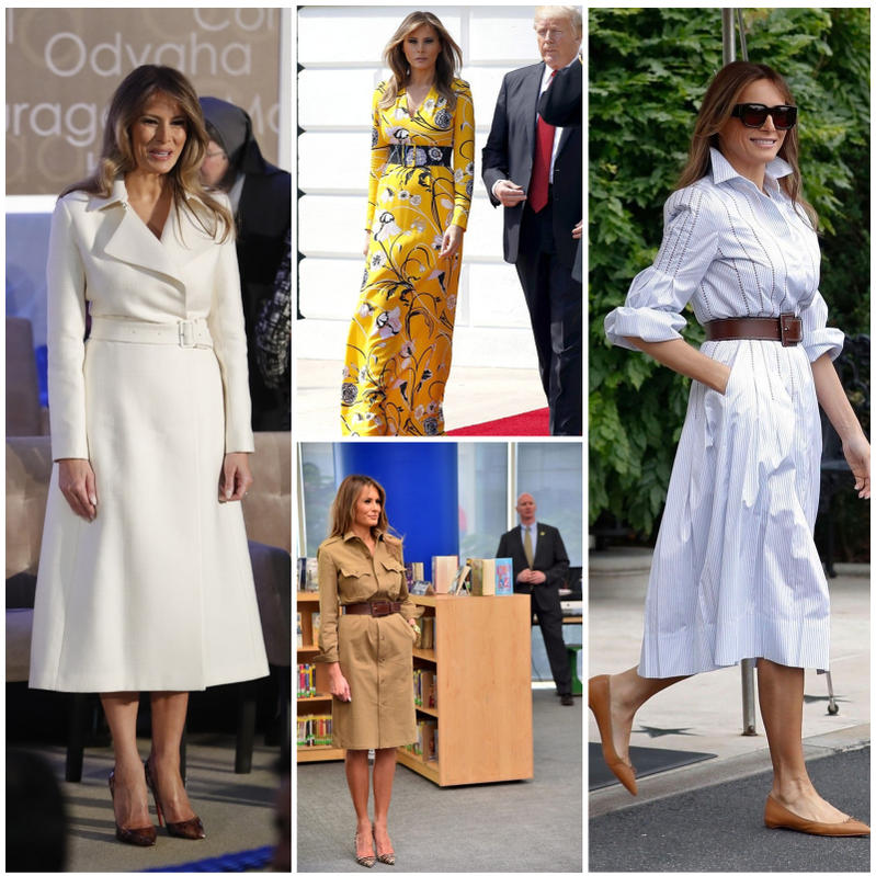 Những chiếc đai lưng có tác dụng làm điểm nhấn nhá giúp vòng eo của Melania trông thon gọn hơn mà vẫn vô cùng duyên dáng thanh lịch trong những bộ đồ kín đáo. Vì lẽ đó, bà khá ưu ái việc thắt đai lưng dù là vận trang phục thường ngày hay âu phục thanh lịch trong những chuyến công du.