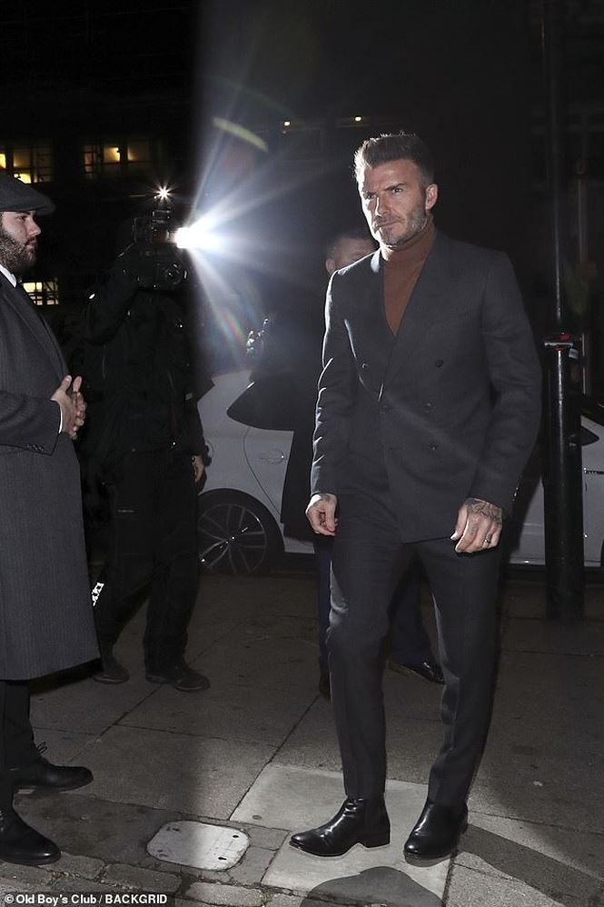 David Beckham xuất hiện lịch lãm như thường ngày trong bộ vest đen kết hợp áo len cao cổ và giày da bóng lộn.