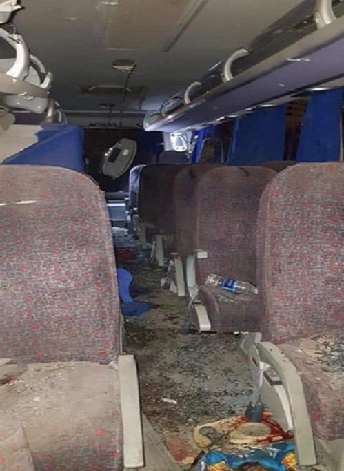 Những vệt máu loang lổ bên trong chiếc xe buýt bị tấn công. Cửa sổ xe buýt vỡ nát, trên sàn xe đầy mảnh kính.