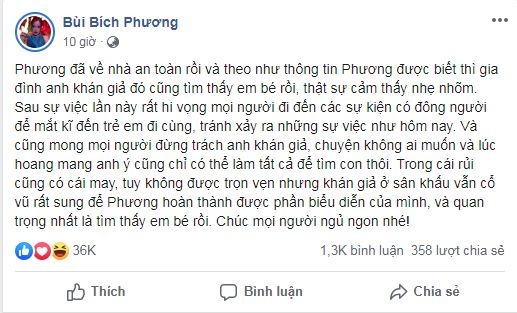 Kết thúc buổi trình diễn, Bích Phương lập tức bày tỏ suy nghĩ trên trang facebook cá nhân rằng: "Phương đã về nhà an toàn rồi và theo như thông tin Phương được biết thì gia đình anh khán giả đó cũng tìm thấy em bé rồi, thật sự cảm thấy nhẹ nhõm. Sau sự việc lần này rất hi vọng mọi người đi đến các sự kiện có đông người để mắt kĩ đến trẻ em đi cùng, tránh xảy ra những sự việc như hôm nay. Và cũng mong mọi người đừng trách anh khán giả, chuyện không ai muốn và lúc hoang mang anh ý cũng chỉ có thể làm tất cả để tìm con thôi. Trong cái rủi cũng có cái may, tuy không được trọn vẹn nhưng khán giả ở sân khấu vẫn cổ vũ rất sung để Phương hoàn thành được phần biểu diễn của mình, và quan trọng nhất là tìm thấy em bé rồi. Chúc mọi người ngủ ngon nhé!"