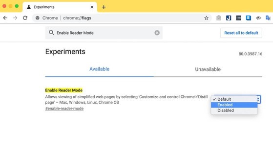 Giống như nhiều trình duyệt khác, Google Chrome cũng hỗ trợ chế độ đọc sách, bằng cách loại bỏ các phần dư thừa và giúp người đọc tập trung hơn vào nội dung. Để kích hoạt, bạn hãy gõ chrome://flags vào thanh địa chỉ, sau đó tìm đến mục Enable Reader Mode, thiết lập thành Enable và nhấn Relaunch để khởi động lại trình duyệt.