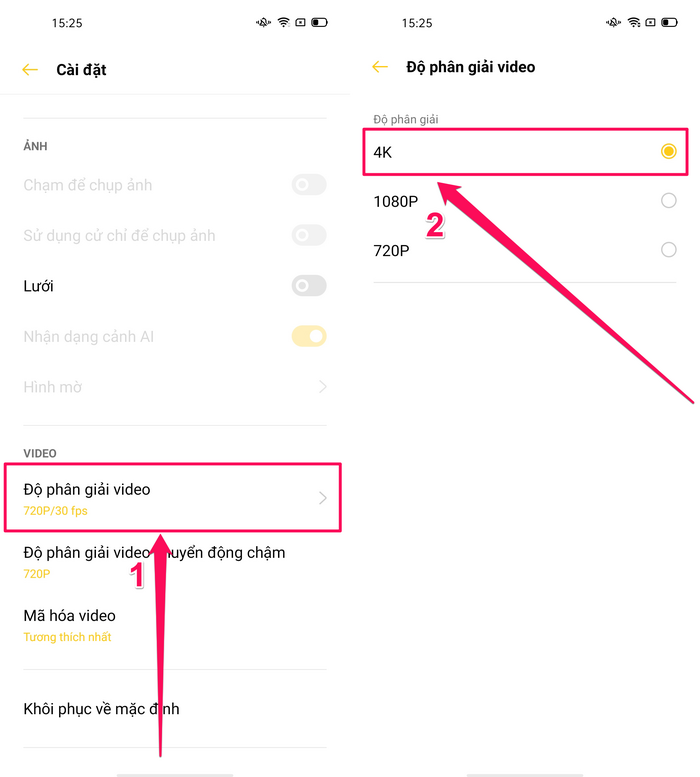 Để OPPO A92 quay được video 4K, bạn vào cài đặt bên trong ứng dụng chụp ảnh, tìm mục Độ Phân Giải Video > chọn 4K.