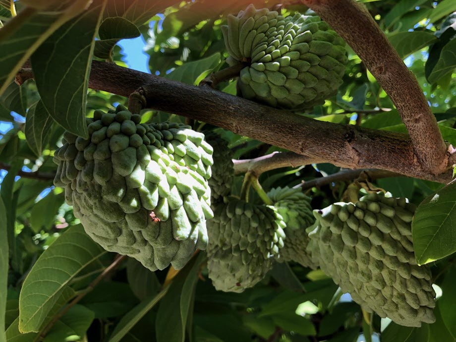 Trái trên cây mãng cầu ở vườn nhà anh Long. (Hình: Đoan Trang/Người Việt)