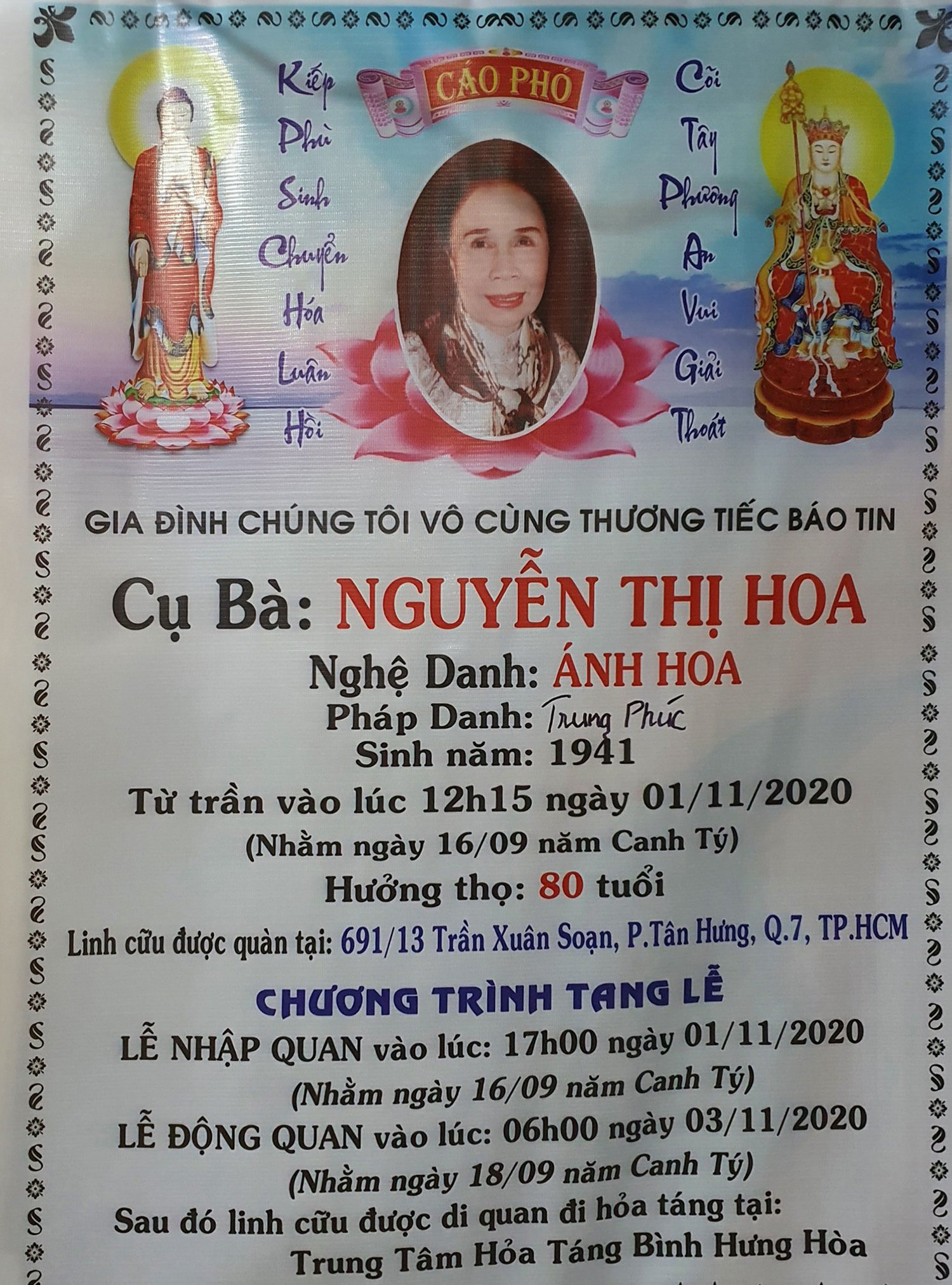 Nghệ sĩ Ánh Hoa qua đời ngày 1/11 tại nhà riêng, hưởng thọ 79 tuổi. Chiều cùng ngày, tang lễ nghệ sĩ Ánh Hoa diễn ra tại nhà riêng.