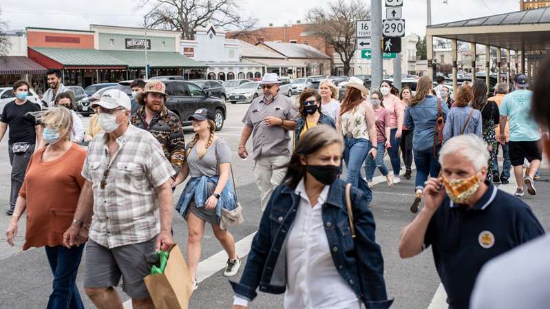 a group of people walking down the street: People with and without masks heading to retail stores, restaurants and bars in Fredericksburg, Texas, this month after Gov. Greg Abbott ended the state’s mask mandate and allowed businesses to open to 100 percent capacity again.© Matthew Busch for The New York Times People with and without masks heading to retail stores, restaurants and bars in Fredericksburg, Texas, this month after Gov. Greg Abbott ended the state’s mask mandate and allowed businesses to open to 100 percent capacity again.