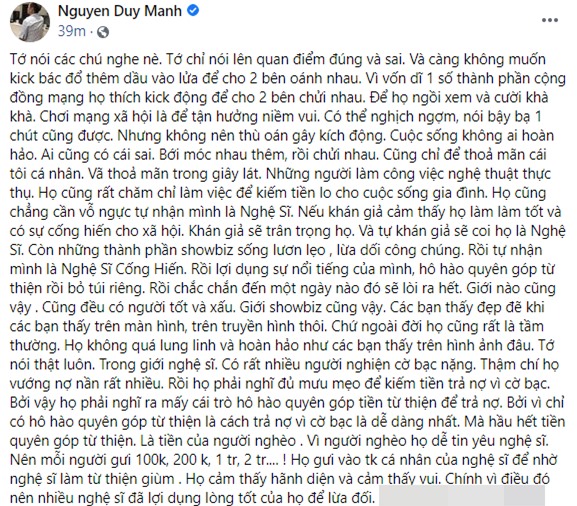 Cụ thể, Duy Mạnh chia sẻ: "Những thành phần showbiz sống lươn lẹo, lừa dối công chúng, rồi tự nhận mình là Nghệ Sĩ Cống Hiến, rồi lợi dụng sự nổi tiếng của mình, hô hào quyên góp từ thiện rồi bỏ túi riêng".