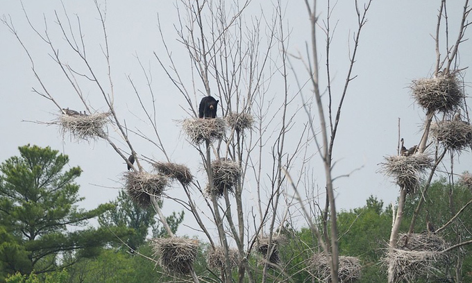 Ken MacDonald cùng vợ Susan bắt gặp gấu đen (Ursus americanus) chưa trưởng thành nặng khoảng 34 kg trèo lên tổ chim để kiếm ăn trong bãi sinh sản của chim diệc ở thị trấn Severn, Canada, Mail hôm 16/6 đưa tin. "Susan rất lo cho sự an toàn của chim diệc, cả con non lẫn con trưởng thành. Tôi cũng e ngại hành vi săn mồi có thể ảnh hưởng lớn đến quần thể diệc vốn rất khỏe mạnh. Tuy nhiên, đây là một phần của tự nhiên", Ken chia sẻ.