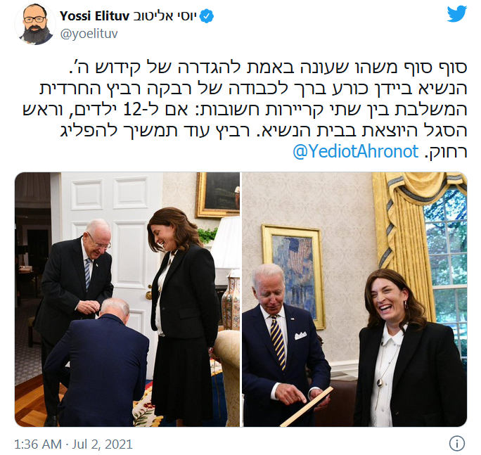 The photo in question was tweeted by Israeli news outlet Yedioth Ahronoth here on July 2 with the description: “@POTUS Jokingly kneels to Rivka Ravitz, the chief of staff of the Israeli president @PresidentRuvi, after she told him she is a mother to 12 (!) children.” The outlet credited the photo to Haim Tzach of the Israeli Government Press Office.
