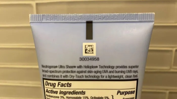 Ảnh ví dụ về kem chống nắng Neutrogena Ultra Sheer with Helioplex Technology. Số lô và ngày hết hạn của sản phẩm được liệt kê ở phía sau, gần đầu. Ảnh: Cortney Moore.