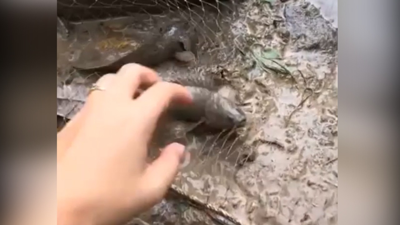Cô gái mỏi tay nhặt cá rô đồng sau mưa. Cá rô đồng từ ruộng lên mặt đường, thậm chí đến tận cửa khiến cô gái không thể bỏ qua.