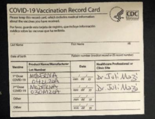 In July, the investigator said in court papers, he received a package containing a CDC COVID-19 vaccination card marked with the name and date of birth he provided and a cellphone screenshot showing that the information he provided had also been added to the state database.