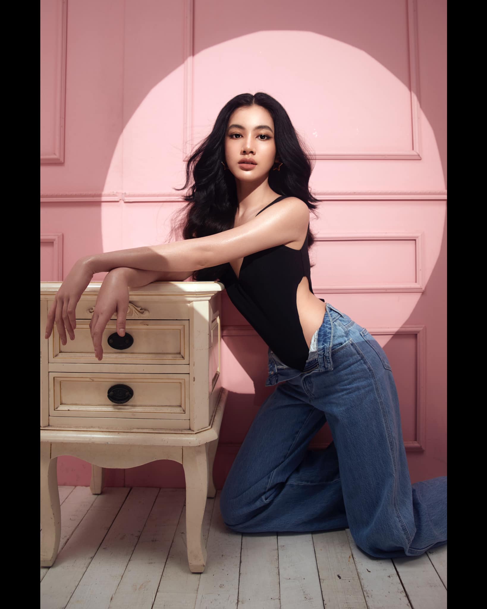 Mới đây nhất, người đẹp tung loạt ảnh cô diện body-suit kèm quần jeans vô cùng ấn tượng. Bộ body-suit màu đen bó sát với những đường cắt xẻ bạo tay giúp Cẩm Đan khoe trọn hình thể nóng bỏng.