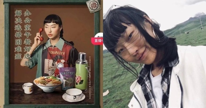 Cai Niangniang trên poster quảng cáo và ngoài đời.