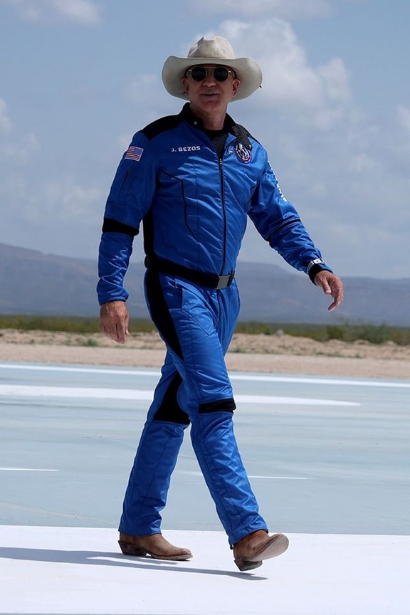 Jeff Bezos hiện đã 57 tuổi, ông yêu thích các phụ kiện, nhưng điều này lại khiến những người ghét ông có cơ hội chế giễu gu thẩm mỹ có phần màu mè. Vào tháng 7/2021, người sáng lập Amazon và doanh nghiệp hàng không vũ trụ Blue Origin, đã bay lên vũ trụ trong khi đội chiếc mũ cao bồi khá lạ mắt từ cửa hàng cao cấp Kemo Sabe của Aspen. Bạn gái của Bezos, phóng viên Lauren Sánchez, cũng có phong cách tương tự.