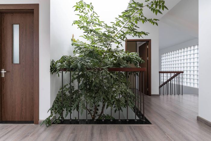 Để không khí trong nhà được luân chuyển đối lưu giữa các tầng nhà, KTS đã bố trí một khoảng thông tầng. Khoảng thông tầng không chỉ giúp cho không gian mát mẻ hơn, cung cấp đủ ánh sáng tự nhiên mà còn là nơi bố trí cây xanh để điều hòa khí hậu toàn bộ ngôi nhà.